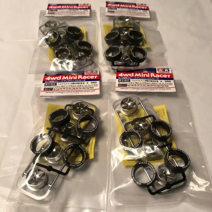 풀 카울 미니 사륜구동 25주년 기념 슈퍼 하드 타이어 & 매트 크롬 도금 휠 (스파이럴) 미사용품 4세트입니다. 내용물은 비교적 깨끗한 상태이지만, 일부는 택에 구김이나 외부 가방에 흠집이 있는 것도 포함됩니다. 신경 쓰이시는 분은 삼가해 주시기 바랍니다.