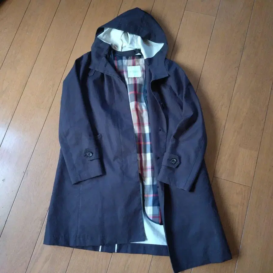 후드 부착 네이비 트렌치코트, 체크 무늬 안감과 퀼팅 사양. - 색상: 네이비 - 디자인: 후드 부착 - 안감: 체크 무늬 - 충전솜: 퀼팅 - 버튼: 2개 버튼 이너 있음 방문해 주셔서 감사합니다.