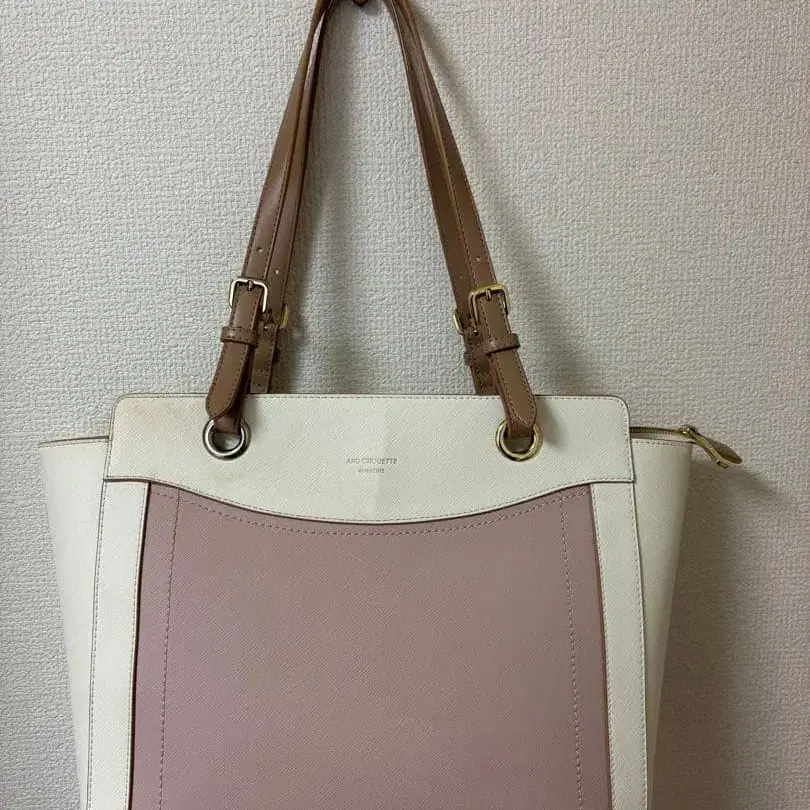 화이트와 핑크 토트백, 조정 가능한 스트랩 포함.
