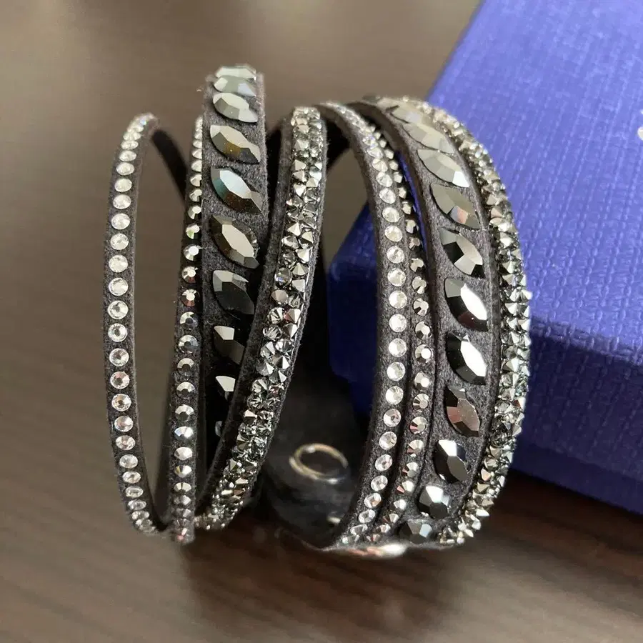 블랙 스웨이드풍의 받침대에 투명한 작은 스와로브스키와 중앙에 블랙의 큰 스와로브스키가 늘어선 품격 있는 화려한 팔찌입니다.