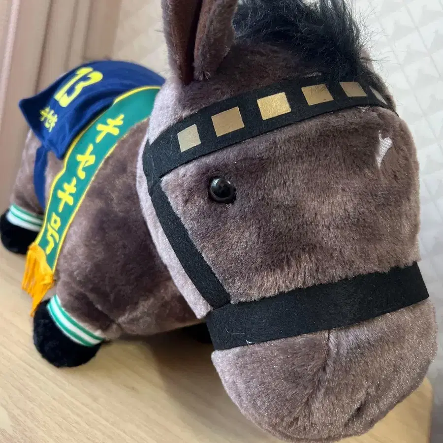 블랙 하네스를 착용한 브라운 말 봉제 인형, 번호 13 디자인. - 색상: 브라운 - 특징: 말 봉제 인형, 블랙 하네스, 파란색 의류, 번호 13 - 사이즈: 중형 BIG 키세키 서러브레드 컬렉션 방문해 주셔서 감사합니다.