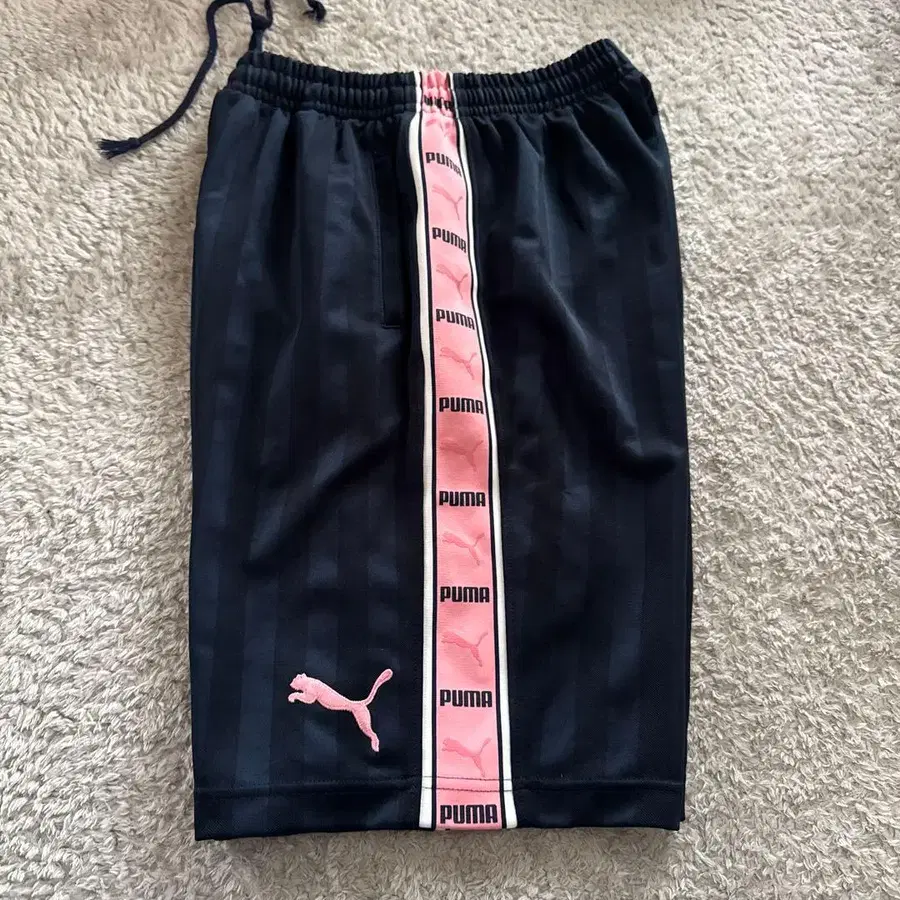 자동 번역되었어요. 원문보기다크 블루 스트라이프 디자인, 핑크 푸마 로고가 특징인 폴리에스테르 소재 숏팬츠.