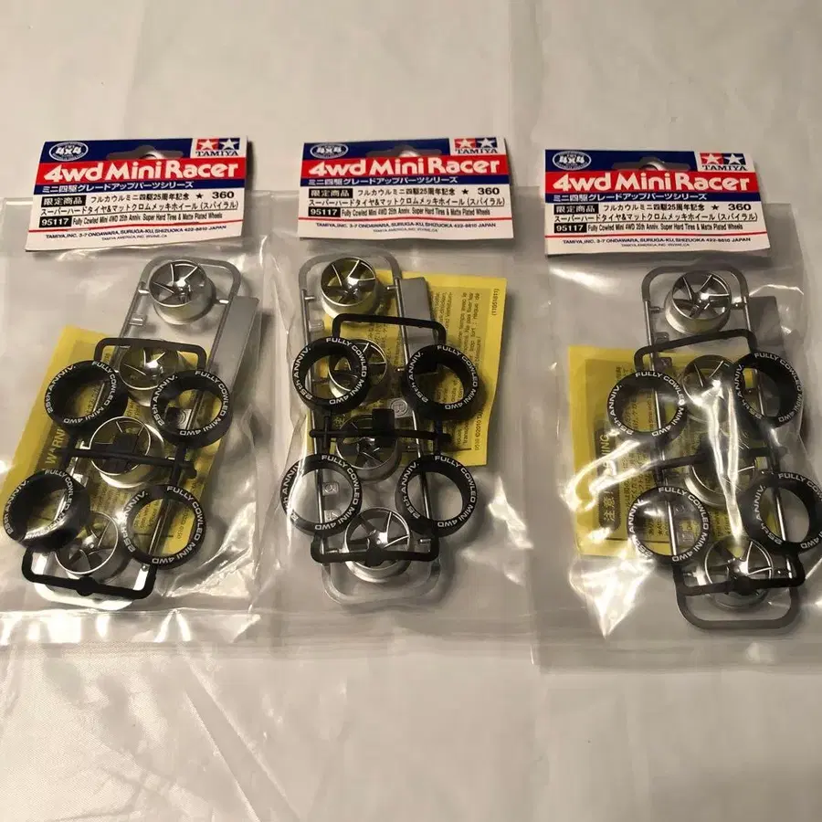 풀 카울 미니 사륜구동 25주년 기념 슈퍼 하드 타이어 & 매트 크롬 도금 휠 (스파이럴) 미사용품 3세트입니다. 내용물은 비교적 깨끗한 상태이지만, 일부는 택에 구김이나 외부 가방에 흠집이 있는 것도 포함됩니다. 신경 쓰이시는 분은 삼가해 주시기 바랍니다.