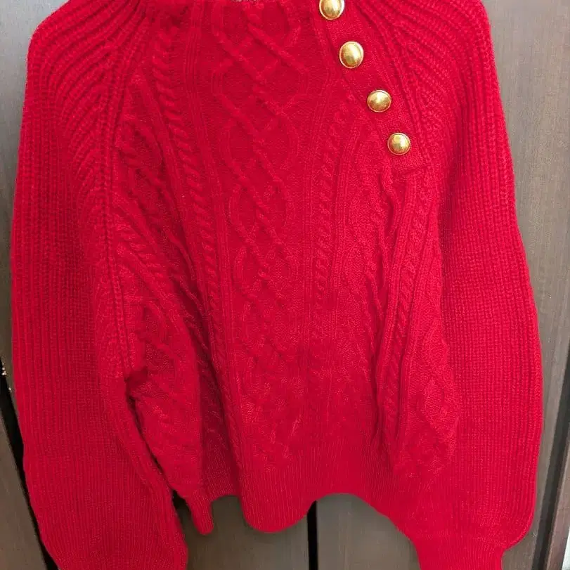 케이블 니트 디자인의 빨간색 오버사이즈 스웨터, 골드 컬러 버튼 포함. - 색상: 빨간색 - 디자인: 케이블 니트 - 버튼: 골드 컬러 버튼 - 소매: 리브 - 스타일: 오버사이즈 방문해 주셔서 감사합니다.