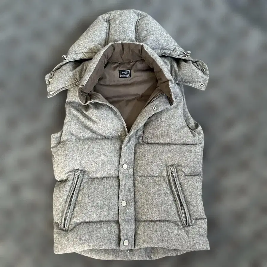자동 번역되었어요. 원문보기후드 부착 그레이 다운 베스트, 폴리에스테르 혼방 소재로 쾌적한 착용감.