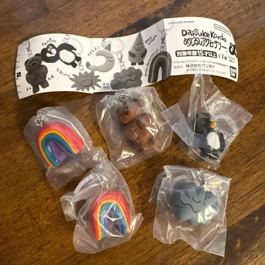 Daisuke Kondo의 캡슐 토이 5개 세트, 귀여운 디자인이 매력적입니다. 가챠가챠에서 뽑았는데 중복되어 판매합니다. 정가 300엔 - 세트 내용: 캡슐 토이 5개 세트 - 디자인: 레인보우 x 2, 곰, 펭귄, 구름 - 패키지: 미개봉 새상품 상태 방문해 주셔서 감사합니다.