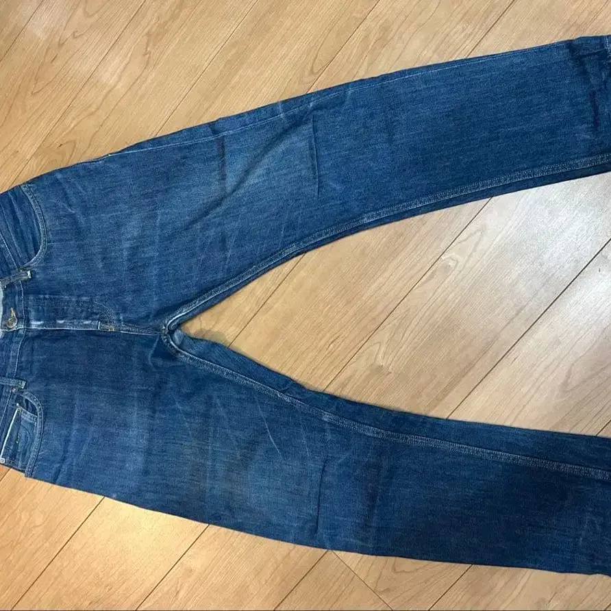 다크 블루 슬림핏 데님, 심플한 디자인에 백 포켓이 있습니다.