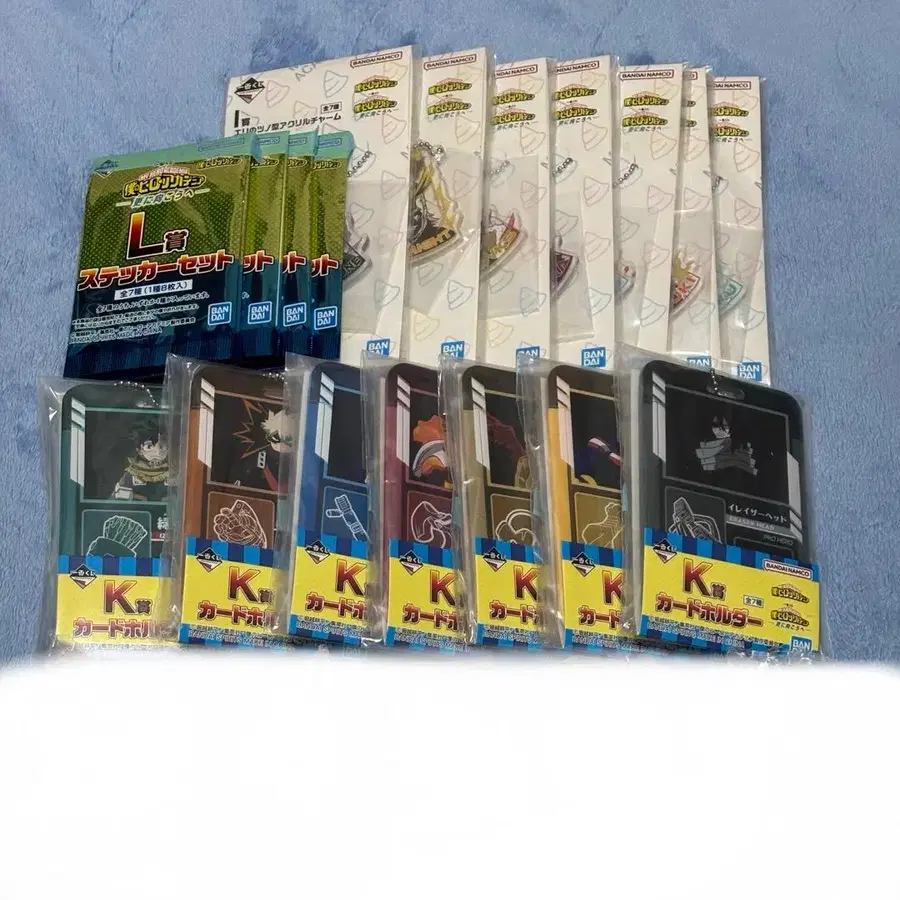 확인을 위해 거울 카드와 스티커 개봉 완료 I상 엘리의 뿔 모양 아크릴 참 총 7종 J상 히어로 카드풍 아크릴 거울 카드 총 7종 K상 카드 홀더 총 7종 L상 스티커 세트 총 7종 하위상 풀 컴플리트