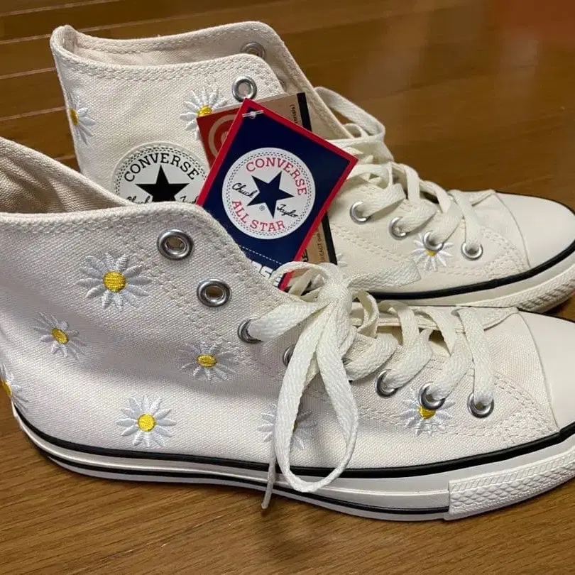 꽃무늬 자수가 들어간 화이트 하이컷 스니커즈. - 브랜드: CONVERSE - 모델: ALL STAR - 색상: 화이트 - 디자인: 데이지 - 스타일: 하이컷 방문해 주셔서 감사합니다. 색상 - 화이트 계열 10월경 구매 후, 그대로 자택 보관 중입니다. 잘 부탁드립니다.