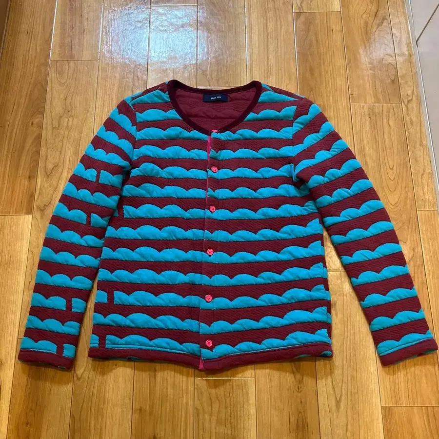 akala ono(아칼라 오노)의 퀼팅 가디건입니다. 색상은 홍차색과 터콰이즈 블루입니다. 버튼은 핑크색입니다. 평평하게 놓았을 때 치수는 기장 60cm 가슴 너비 42cm 입니다. 유즈드 상품이므로 이해하시는 분들의 검토 부탁드립니다.