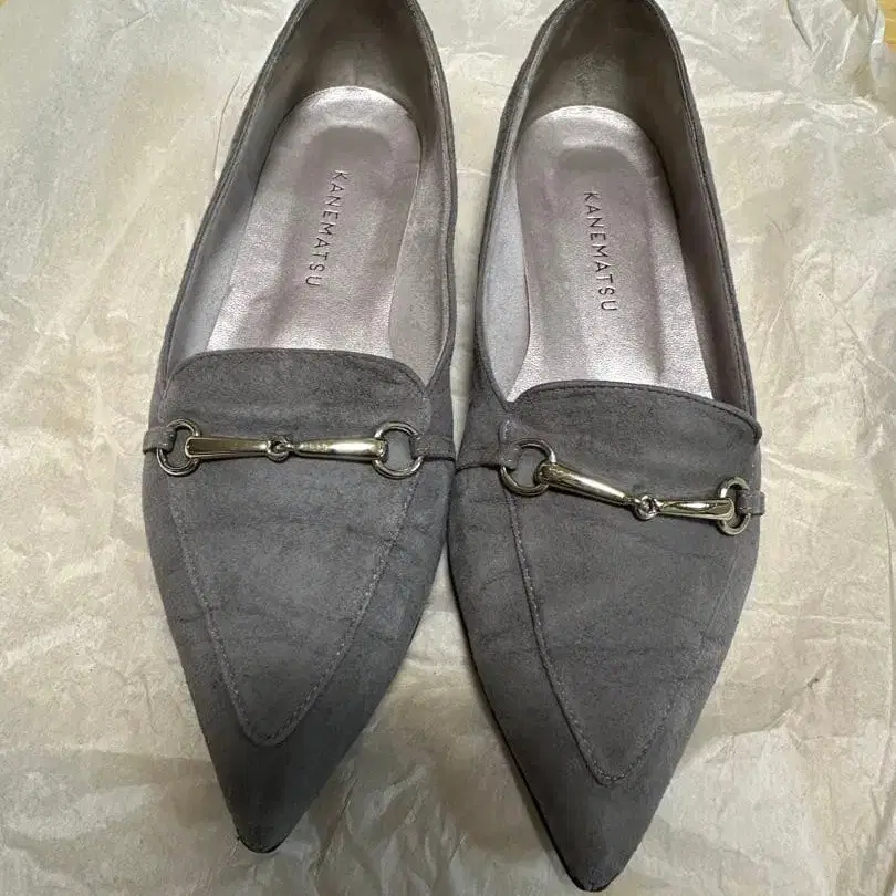 스웨이드 느낌의 그레이 플랫슈즈, 스틸레토와 금장 장식의 장식이 특징입니다. - 브랜드: KANEMATSU - 색상: 그레이 - 디자인: 스틸레토, 장식적인 금장 장식 포함 - 소재: 스웨이드 느낌 - 스타일: 플랫슈즈 방문해 주셔서 감사합니다. 사이즈 - 23cm