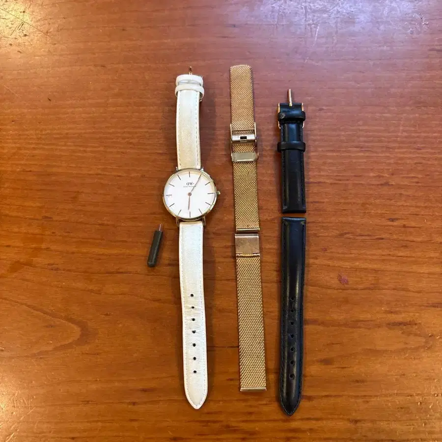 화이트 가죽과 골드 메쉬의 교환 가능한 밴드가 있는 시계. - 색상: 화이트 - 소재: 가죽 - 밴드 타입: 교환 가능 - 스타일: 캐주얼 - 색상: 골드 - 밴드 타입: 메쉬 - 스타일: 포멀 - 소재: 메탈 사용감 있음, 배터리 방전되었습니다. 자택 보관 중입니다. 신경 쓰이지 않는 분은 잘 부탁드립니다. 방문해 주셔서 감사합니다.