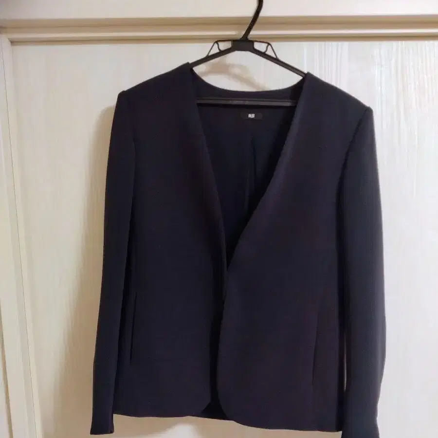 싱글 브레스티드 네이비 자켓, 폴리에스테르 65%와 레이온 35% 소재로 비즈니스 장면에 최적입니다.