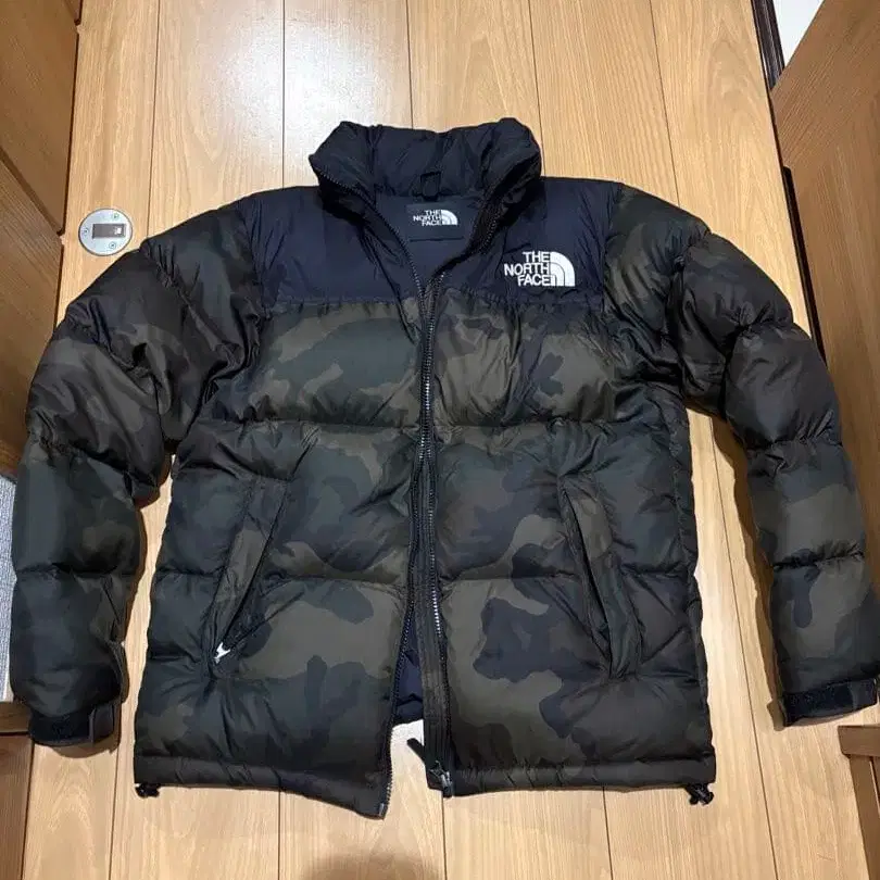 카모플라쥬 디자인의 다운 자켓, 풀 집업과 벨크로 소매로 기능성도 뛰어납니다.