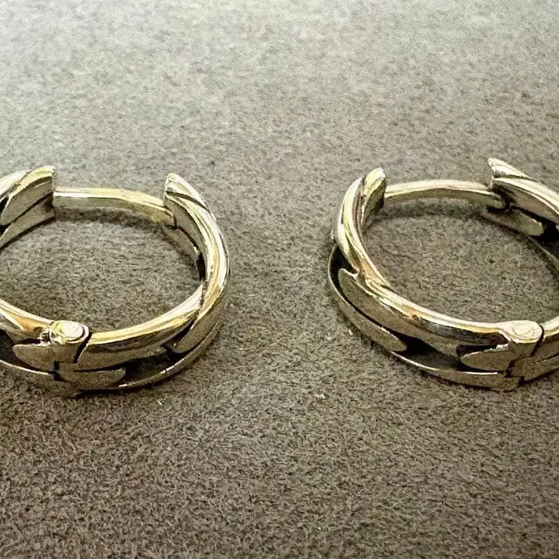 12월에 구매했지만 미사용품입니다. 팔리지 않으면 사용할 생각이라 가격 인하는 불가합니다. 박스 있음, 구매 증명 있음입니다. 실버 체인 링크 디자인의 후프 귀걸이. - 소재: 실버 - 디자인: 체인 링크 스타일 - 사이즈: 중간 - 타입: 후프 귀걸이 - 수량: 페어 방문해 주셔서 감사합니다.