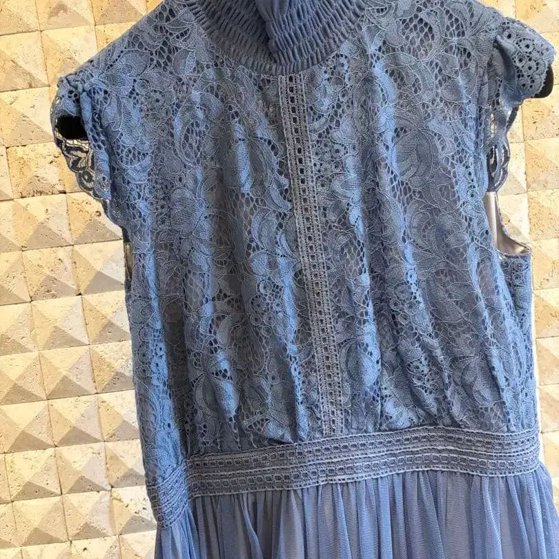 레이스와 쉬폰 소재의 아름다운 라이트 블루 드레스, 하이넥 디자인으로 엘레강트한 인상을 줍니다. 한 번 착용 후 클리닝 완료 - 색상: 라이트 블루 - 소재: 레이스와 쉬폰 - 디자인: 하이넥과 플레어 스커트 - 스타일: 슬리브리스 - 특징: 허리에 장식적인 스트라이프 방문해 주셔서 감사합니다. 사이즈 - M