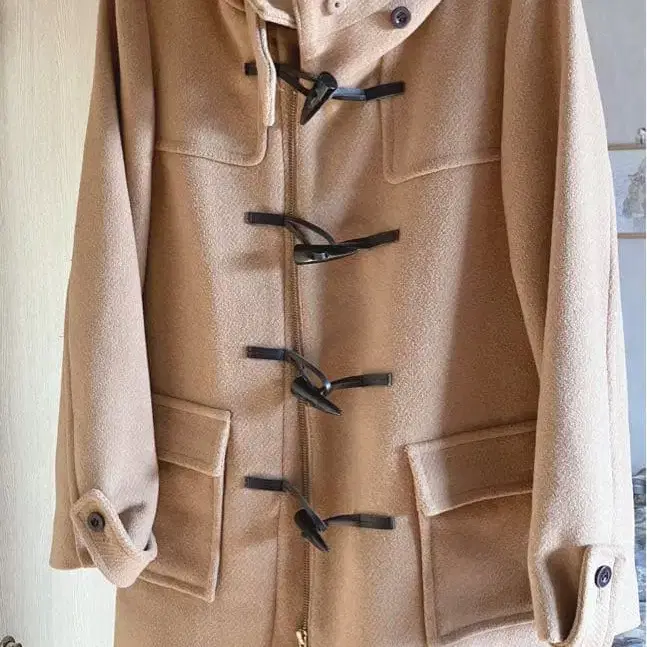 베이지 색상의 더플 코트, 후드 부착 디자인에 토글 버튼이 달려 있습니다.