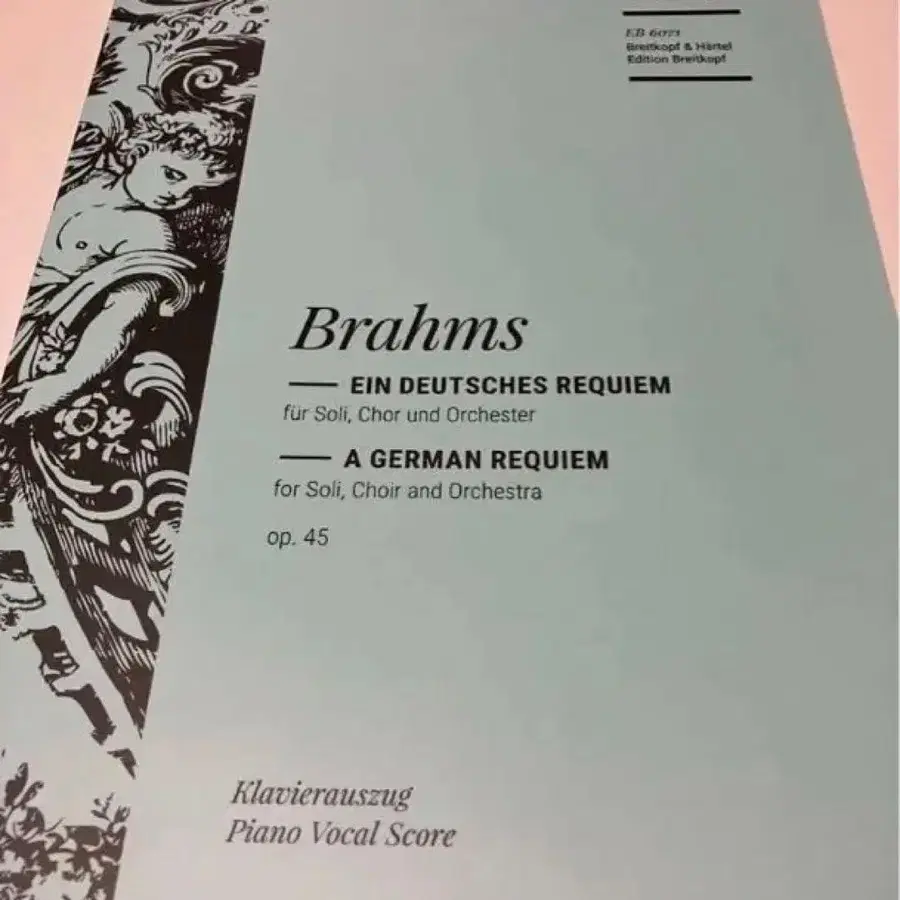 브람스의 [ 독일 레퀴엠 ] 피아노 보컬 스코어, Breitkopf & Härtel 판. - 타이틀: Brahms: Ein Deutsches Requiem, op. 45 - 형식: 피아노 보컬 스코어 - 출판사: Breitkopf & Härtel - 언어: 독일어, 영어 - 작곡가: Johannes Brahms - 판: Edition Breitkopf 6071 방문해 주셔서 감사합니다. 한 번도 사용하지 않아 새상품급 상태입니다.