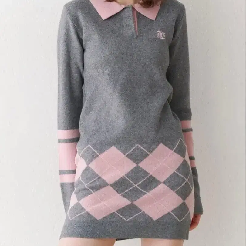 쥬에티의 아가일 무늬 그레이와 핑크 색상의 긴팔 미니 원피스.