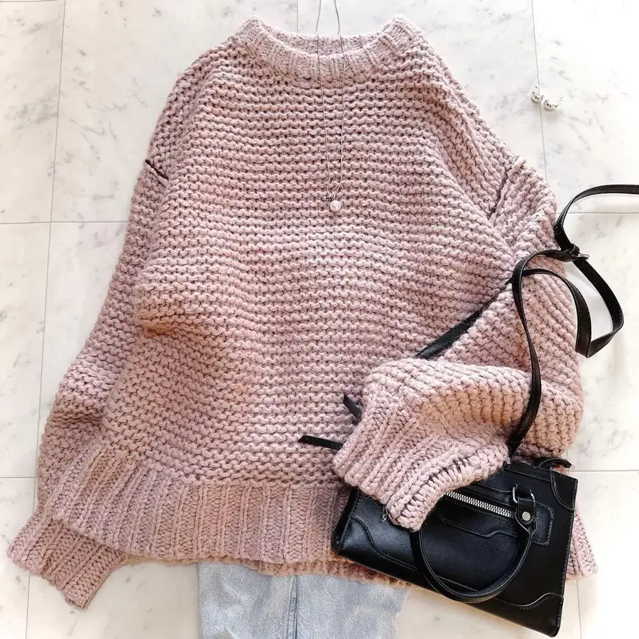 • 라메 믹스 부클레 골지 니트 핑크