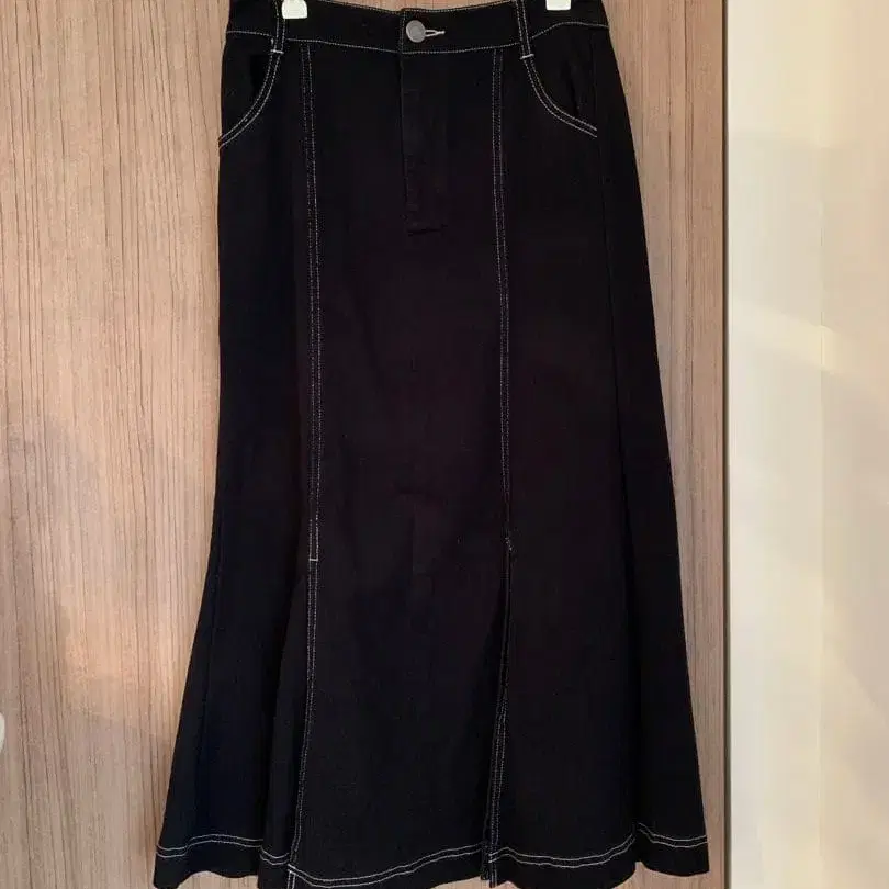 데님 원단 블랙에 화이트 스티치 두께감 있고 탄탄한 소재 스트레치가 있어 스타일이 좋아 보입니다. 프론트 밑단에 슬릿 2개 있음. 귀엽고 걷기 편합니다. 5회 정도 착용. 딸이 더 이상 입지 않는다고 해서 내놓습니다. 중고품임을 이해하신 후 구매 부탁드립니다.