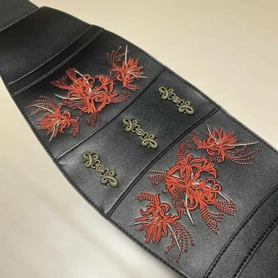 블랙 합성 피혁에 꽃무늬 자수가 놓인 조정 가능한 벨트. - 색상: 블랙 - 디자인: 꽃무늬(피안화) 자수 - 사이즈: 전체 길이 77, 폭(최대) 17 - 소재: 합성 피혁 방문해 주셔서 감사합니다. 기모노나 화양절충 스타일에도 사용 가능합니다. 두꺼운 벨트입니다. 완판템