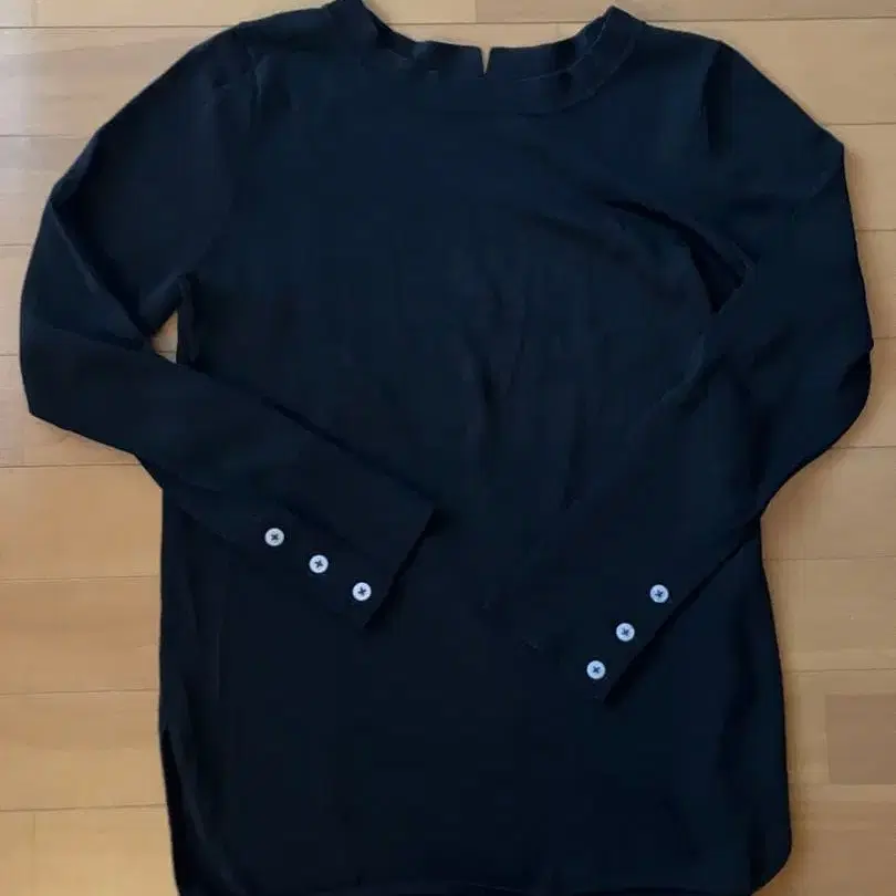 부드러운 블랙 긴팔 상의. 뒤쪽의 V자 컷 옷깃과 버튼이 달린 소매가 특징입니다. 사이드 슬릿과 소매의 화이트 버튼이 포인트입니다. - 색상: 블랙 - 소매 버튼: 버튼 4개 - 옷깃 디자인: V자 컷 - 소재: 부드러운 원단 - 밑단 디자인: 뒤쪽이 긴 디자인 방문해 주셔서 감사합니다. 색상 - 블랙 계열 넥 - 크루넥/U넥 계절 - 봄/여름