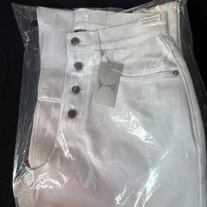 하이웨스트 디자인의 화이트 데님, 프론트 버튼으로 스타일리시합니다.