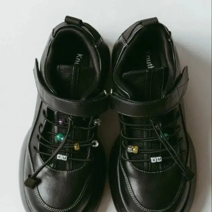 통굽 디자인의 블랙 스니커즈, 컬러풀한 비즈가 특징. 한 번만 신어서 새상품급입니다. - 색상: 블랙 - 디자인: 통굽 스니커즈 - 스트랩: 벨크로 테이프 포함 - 장식: 컬러풀한 비즈 포함 - 밑창 타입: 통굽 밑창 방문해 주셔서 감사합니다. 사이즈 - 24.5cm