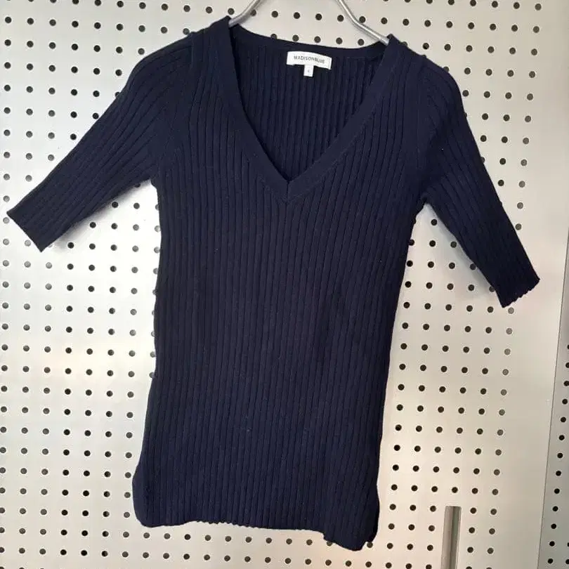 네이비 리브 V넥 5부 소매 니트. 아주 오래전에 구매했으며, 1~2회 착용하지 않아 새상품급입니다. 사이즈는 0으로 XS 또는 S 정도이며, 매우 슬림한 핏입니다. - 브랜드: MADISONBLUE - 색상: 네이비 - 디자인: 리브 - 소매 길이: 5부 소매 - 넥라인: V넥 - 스타일: 슬림핏 나일론 36% 폴리에스테르 32% 아크릴 23% 모 9% 방문해 주셔서 감사합니다. 색상 - 네이비 계열 넥 - V넥