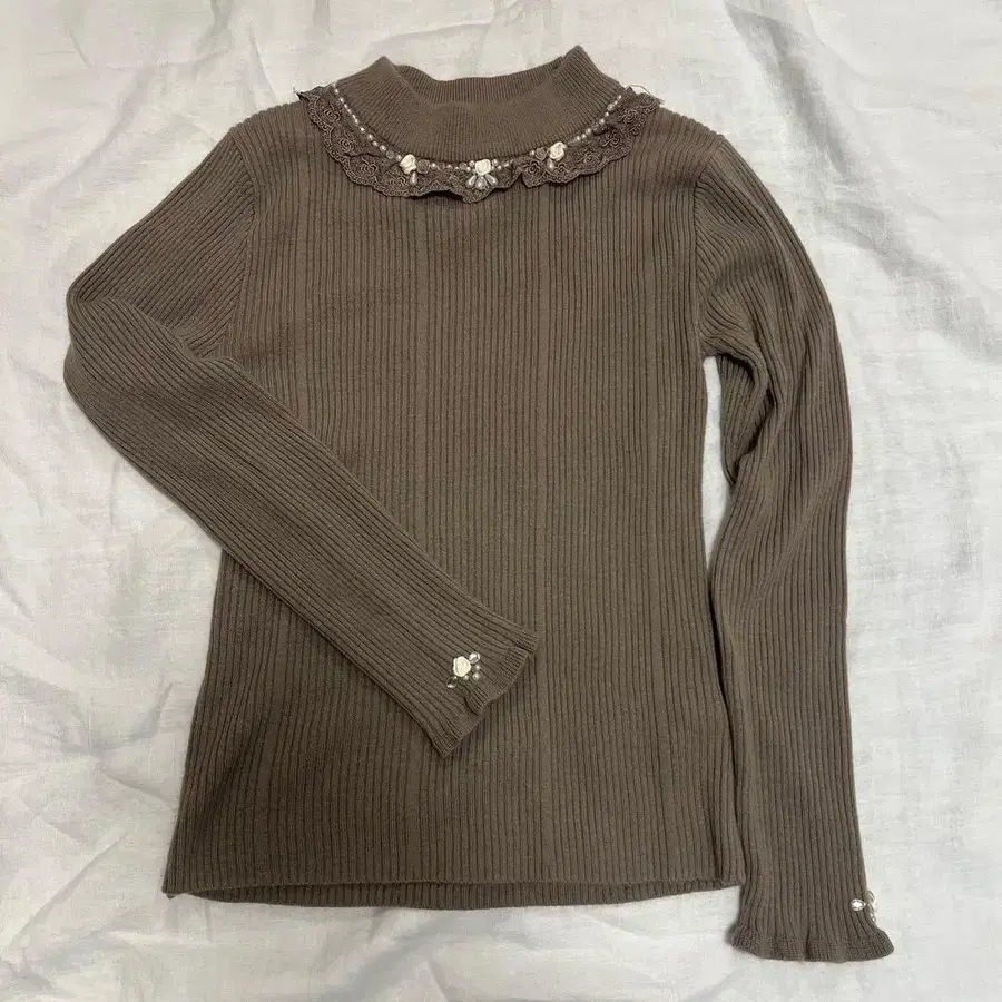 라이트 브라운 색상의 리브 니트 스웨터입니다. 프릴과 꽃 모티브 장식이 특징입니다.
