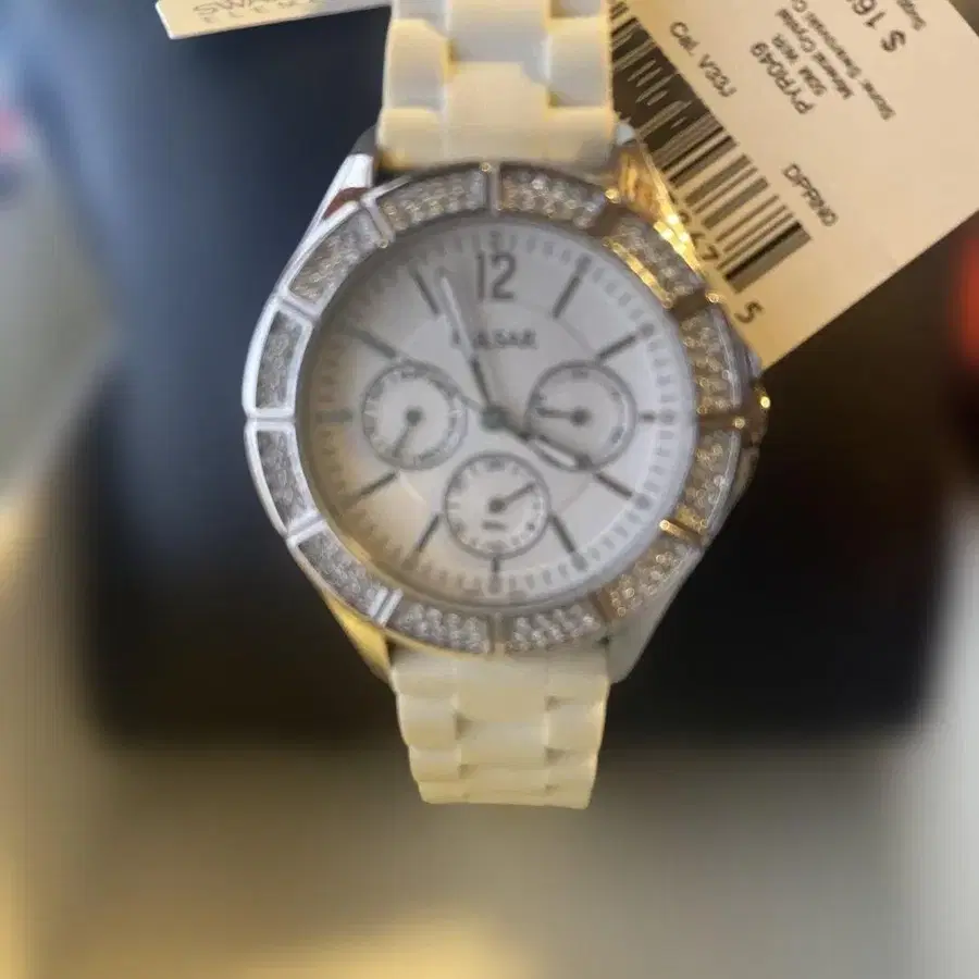 자동 번역되었어요. 원문보기화이트 실리콘 밴드에 SWAROVSKI 스타일 장식이 있는 PULSAR 손목시계.