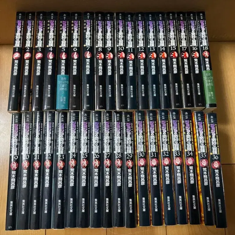 죠죠의 기묘한 모험 문고본 1~39권 세트 팬텀 블러드 전투 조류 스타더스트 크루세이더즈 다이아몬드는 부서지지 않는다 황금의 바람 1부부터 5부까지입니다. 자택 보관품이므로, 중고품에 이해가 있는 분만 구매 부탁드립니다.