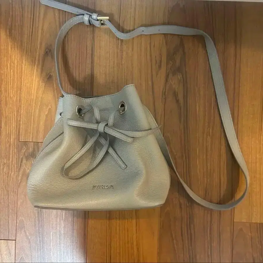 그레이 색상의 가죽 버킷 백, 조정 가능한 스트랩 포함. - 색상: 그레이 - 스타일: 버킷 백 - 소재: 가죽 - 스트랩: 조정 가능