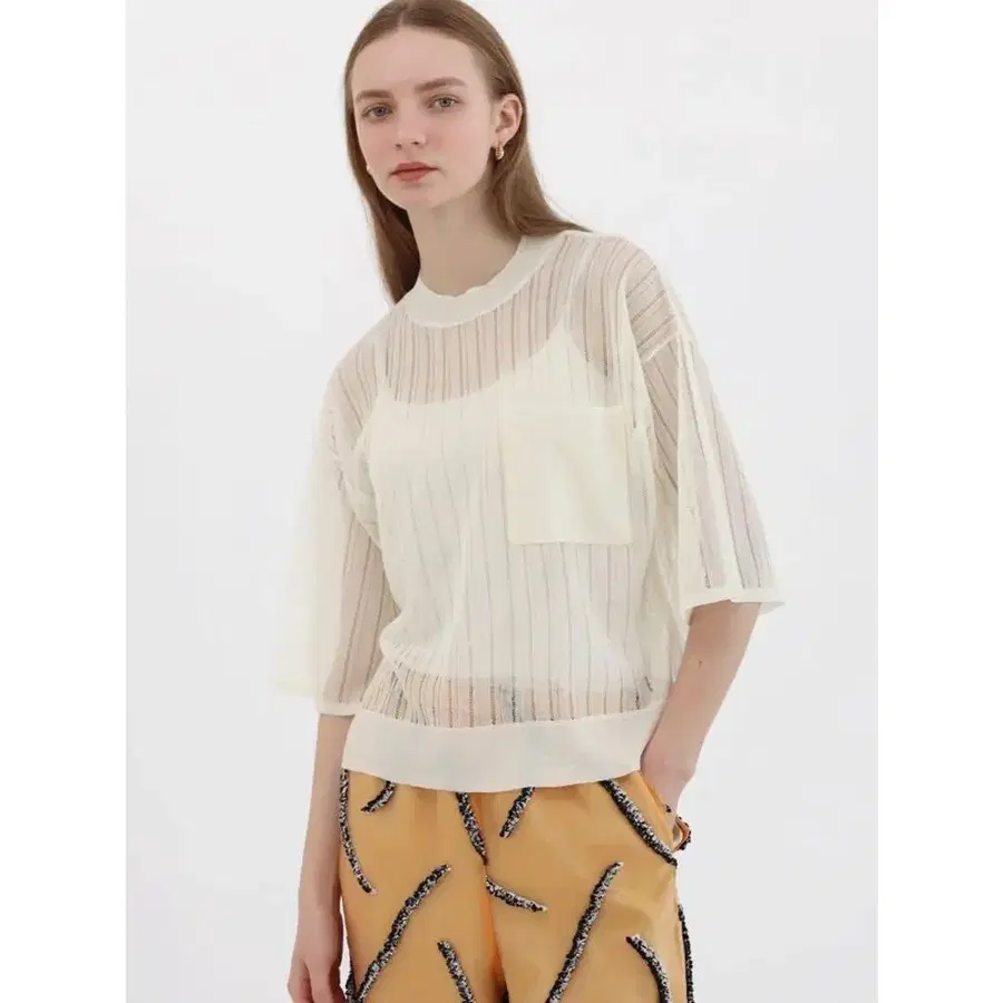 섬세한 시스루 니트 디자인에 빅 사이즈 포켓이 포인트인 아이템. 스트라이프 조의 망사가 바디라인을 흐릿하게 하여 내추럴한 시스루를 연출합니다. 리브와의 대비가 여성스러움을 연출하며, 다가오는 계절에 착용하기 좋은 한 벌입니다.