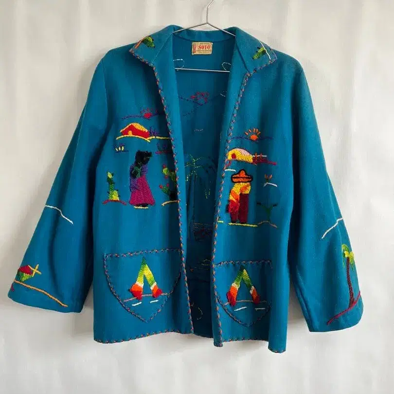 다채로운 자수가 놓인 캐주얼한 파란색 멕시칸 자켓입니다. 연식이 꽤 오래되었음에도 불구하고 상태는 좋은 편이라고 생각합니다. 목 부분 등에 약간의 색바램이 있습니다. - 색상: 파란색 - 자수 디자인: 다채로운 풍경과 인물 자수 - 스타일: 캐주얼 자켓 - 소재: 울 또는 유사 소재 - 소매 디자인: 넓은 소매 - 포켓: 앞면에 포켓 있음 방문해 주셔서 감사합니다. 사이즈 - FREE SIZE