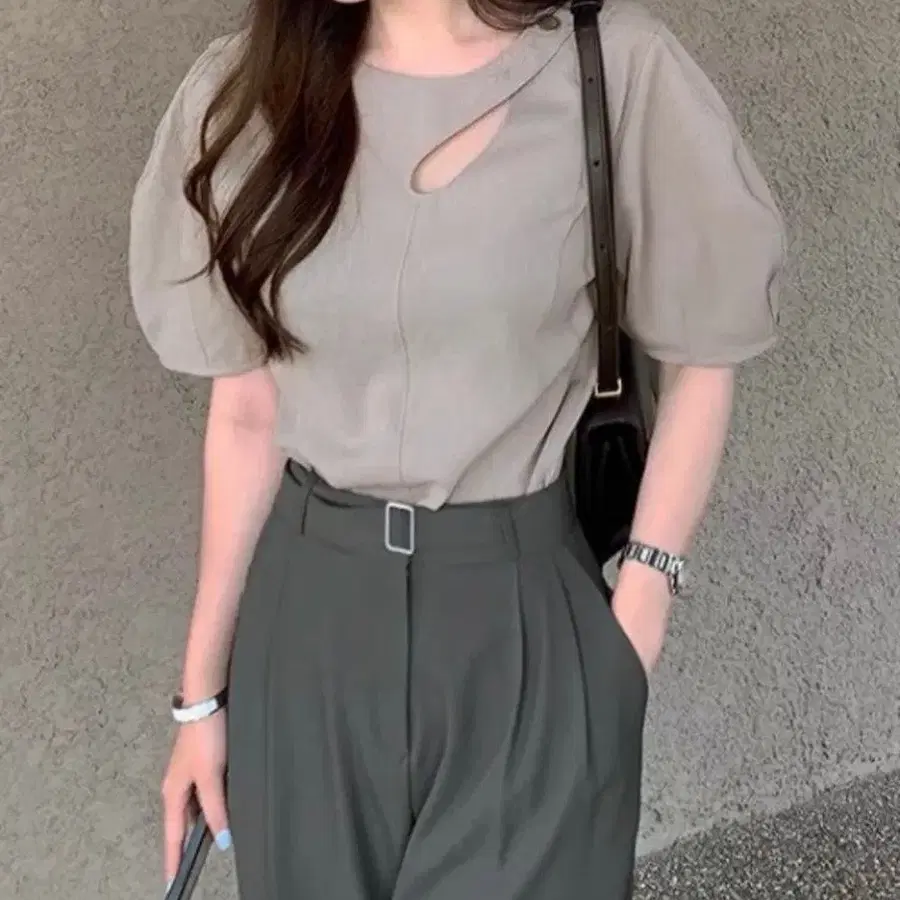 by muni:r (바이무니르) 언밸런스 슬릿 퍼프 블라우스 사이즈: 프리 색상은 그레이지입니다.