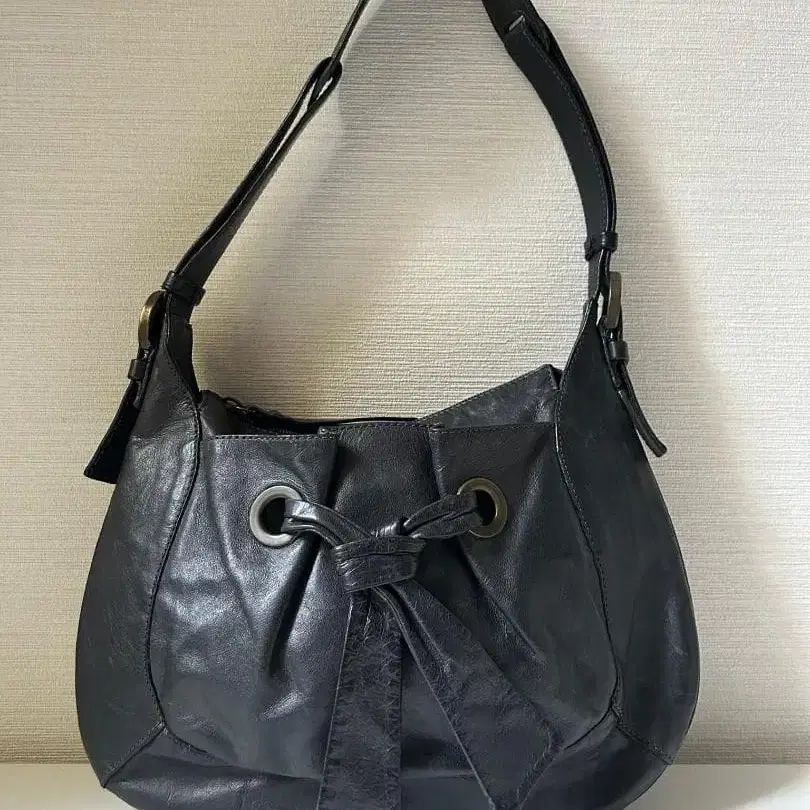 IL BISONTE 로고 메달 가죽 숄더백 블랙 주름 가죽