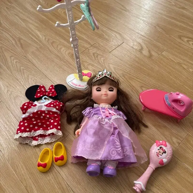 미니 마우스 의상과 티아라가 포함된 인형 세트. - 인형: 인형 - 의상: 미니 마우스 드레스 - 신발: 옐로우 컬러 샌들 - 액세서리: 티아라 - 기타: 인형용 행거와 마라카스 이미지에 보이는 물건만 발송하며 상자는 없습니다. 별도 판매는 하지 않으므로 세트로 구매하셔야 합니다. 어린이가 사용했던 물건이므로 이해하시는 분만 구매 부탁드립니다. 방문해 주셔서 감사합니다.