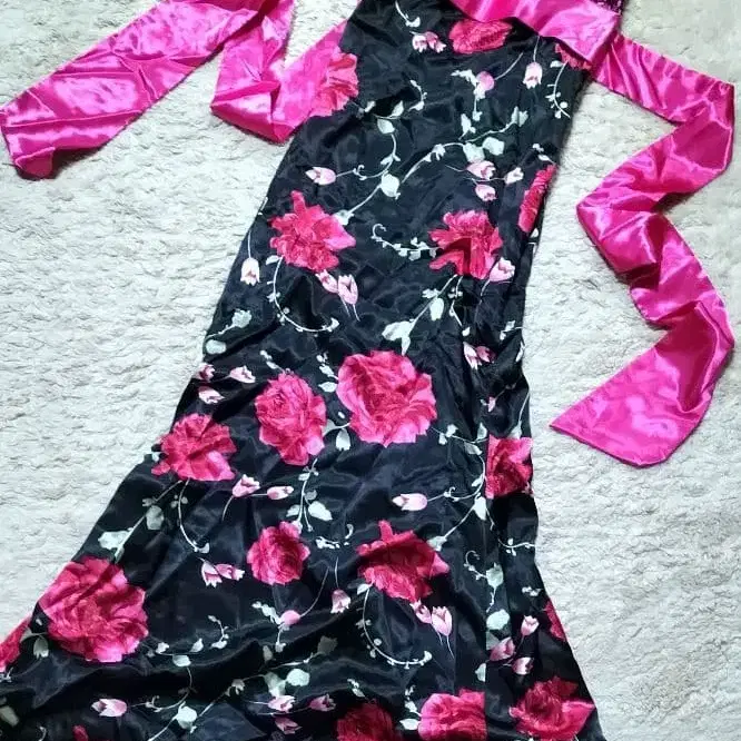 자동 번역되었어요. 원문보기블랙과 핑크 꽃무늬 맥시 드레스, 가슴 부분 레이스와 리본 디자인이 특징입니다.
