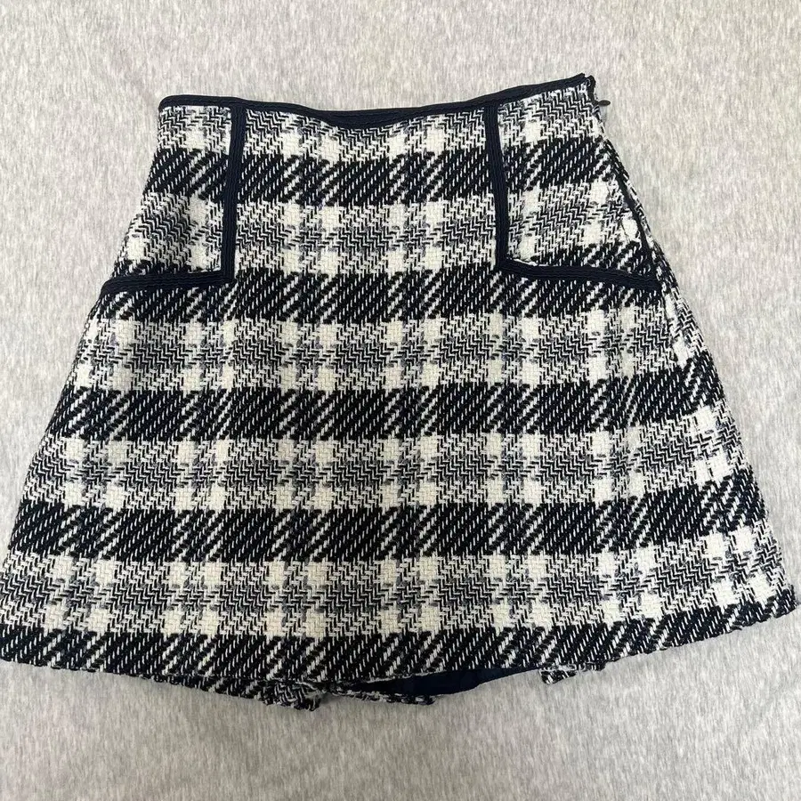 체크 무늬 레이스업 미니 스커트, 트위드풍 원단 사용 - 디자인: 체크 무늬 - 스타일: 레이스업 - 소재: 트위드풍 원단 - 색상: 화이트 x 블랙 - 포켓: 앞면에 포켓 있음