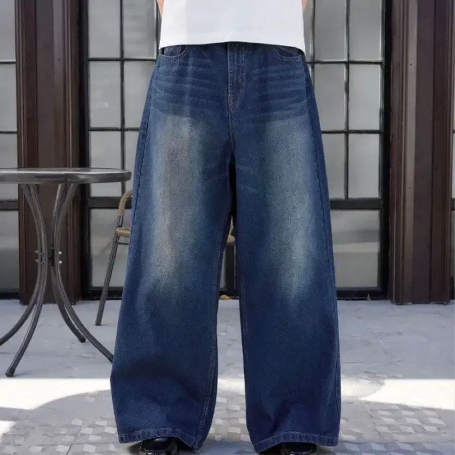와이드 배기 데님 팬츠 - 브랜드: Regen Glanz - 색상: 블루 사이즈: L 허리: 82 힙: 112 팬츠 길이: 103 밑위: 33 인심: 70 허벅지 둘레: 74 밑단 둘레: 65 사이즈 - L