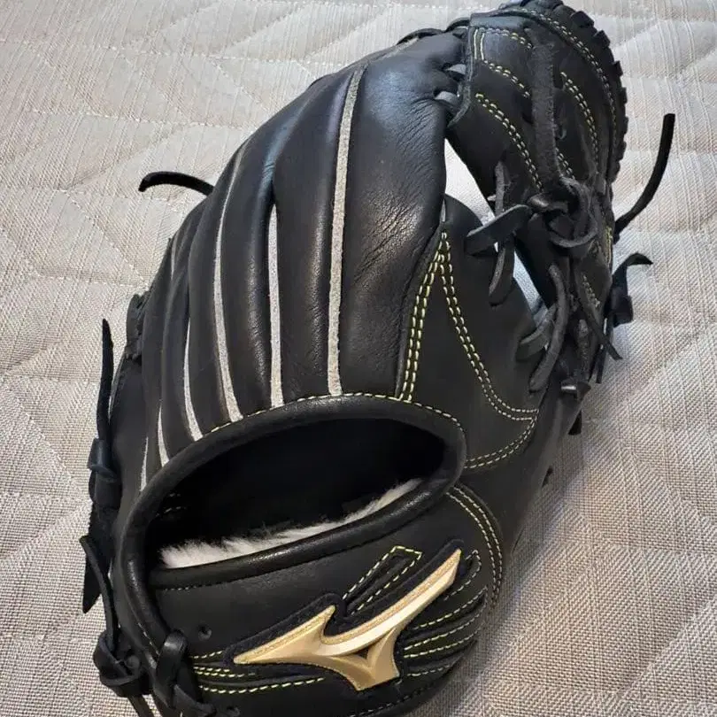 Mizuno의 블랙 레더 야구용 그로브, 골드 컬러 로고가 특징입니다. 초등학교 저학년을 위한 사이즈입니다. - 브랜드: Mizuno - 색상: 블랙 - 특징: 골드 컬러 로고 포함 - 소재: 가죽 - 스타일: 야구용 그로브 방문해 주셔서 감사합니다.