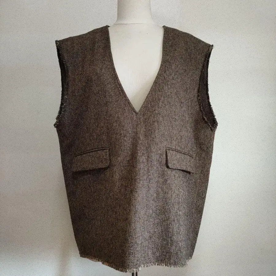 쿨 카레앙 neuf cent neuf의 브라운 계열 트위드풍 원단을 사용한 V넥 슬리브리스 베스트입니다. 깊은 V넥 옷깃, 소매, 밑단의 마감되지 않은 디자인이 멋스럽습니다. 아직 포켓의 시침질도 제거되지 않았습니다. [ 원단 ] 면 100% 안감 폴리에스테르 100% [ 색상 ] 브라운 계열 [ 사이즈 ] O 평평하게 놓았을 때 어깨 너비: 약 50cm 가슴 너비: 약 60cm 총길이: 약 70cm *개인 측정으로, 약간의 오차가 있을 수 있습니다. 포켓 있음 안감 부착 - 색상: 브라운 계열 - 디자인: V넥, 포켓 부착 - 소재: 트위드풍 원단 - 스타일: 슬리브리스