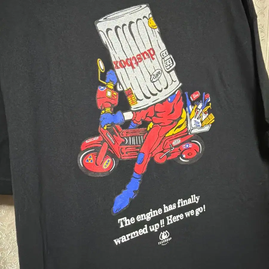 바이크를 타는 캐릭터 그래픽이 특징인 블랙 T셔츠.