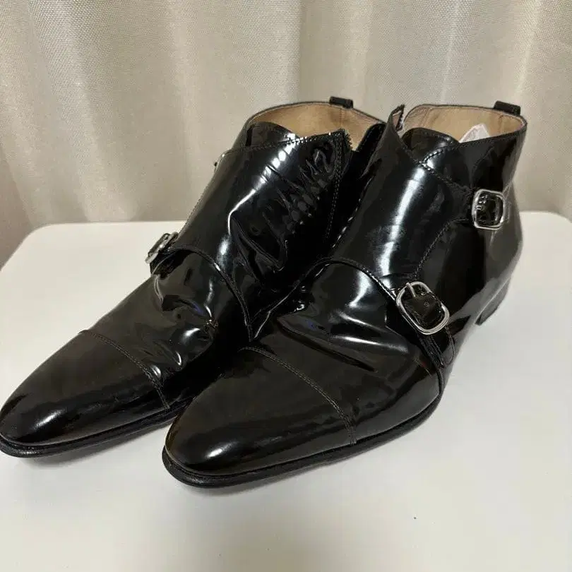 광택이 나는 블랙 에나멜 가죽 소재, 배지가 달린 드레스 슈즈.