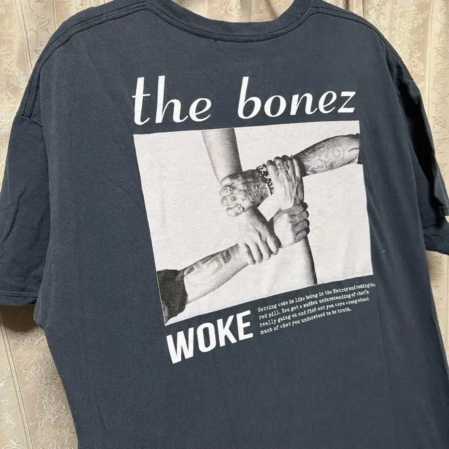 the bonez WOKE 그래픽이 특징인 다크 그레이 T셔츠.