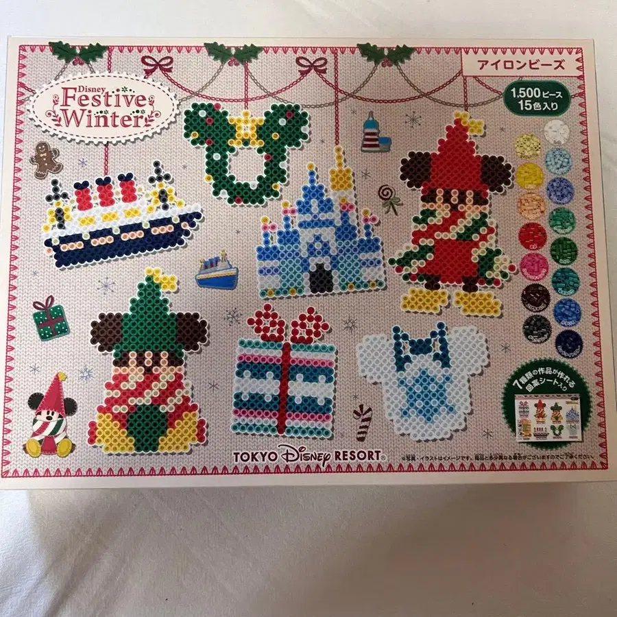 도쿄 디즈니 리조트 한정판 펄러비즈 세트입니다. Festive Winter 디자인으로, 미키, 미니, 신데렐라 성 등 디즈니 캐릭터를 모티브로 한 작품을 만들 수 있습니다. 1500피스, 15색으로 구성되어 있으며, 7종류의 작품을 만들 수 있는 도안 시트도 부속되어 있습니다. 4개를 만들었는데, 비슷한 색상의 펄러비즈가 있다면 도안 시트로 제작 가능합니다.* 발송은 박스 없이 보내드립니다. 부탁드립니다.