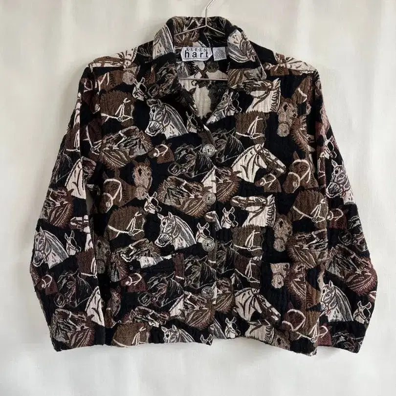 말 패턴 디자인의 긴팔 셔츠, 코튼 폴리에스테르 혼합 소재로 쾌적한 착용감. 가장 위쪽 버튼이 구매 시부터 떨어져 있었습니다. - 브랜드: Keren Hart - 디자인: 말 패턴 - 색상: 브라운, 블랙, 화이트 - 스타일: 긴팔 셔츠 - 소재: 코튼, 폴리에스테르 혼합 방문해 주셔서 감사합니다. 사이즈 - FREE SIZE