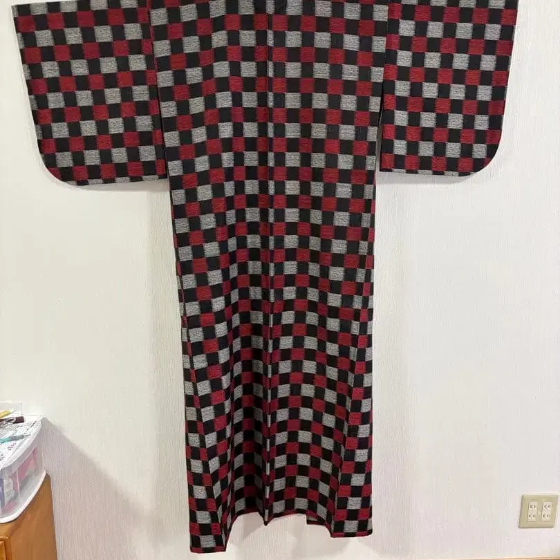 빨간색과 블랙 체크 무늬 기모노 - 디자인: 체크 무늬의 빨간색과 블랙 조합 - 데미지: 안쪽에 작은 얼룩 있음 기장: 149cm 화장: 57cm 소매 길이: 45.5cm 소매 폭: 34cm 앞 폭: 39cm 뒷 폭: 30cm 작게 접어서 발송합니다. 방문해 주셔서 감사합니다.